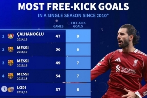 2010年后的五大联赛球员单赛季各项赛事任意球进球榜: