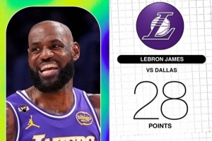 本场比赛,湖人前锋詹姆斯上场35分钟,20投10中得到28分10篮板12助攻。