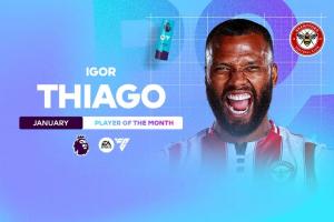 1月份伊戈尔·蒂亚戈出战5场比赛打进5球,帮助布伦特福德取得2胜1平2负的战绩,他也击败了恩佐、多尔古、维尔茨等候选,继去年11月后第二次当选英超月最佳球员。