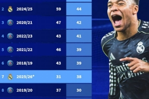 体育资讯2月14日讯 姆巴佩本赛季各项赛事31场比赛已经打进38球,距离个人单赛季俱乐部进球纪录还差6球,以下为具体情况:
