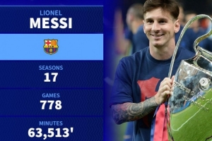 梅西(巴萨):17个赛季,778场,63513分钟,1.8亿