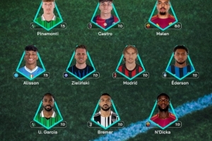 意甲第25轮最佳阵:奥代罗(克雷莫内塞);乌利塞斯·加西亚(萨索洛)、布雷默(尤文)、恩迪卡(罗马);阿利森·桑托斯(那不勒斯)、泽林斯基(国米)、莫德里奇(米兰)、埃德森(亚特兰大);皮纳蒙蒂(萨索洛)、卡斯特罗(博洛尼亚)、马伦(罗马)