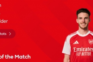 本场比赛赖斯送出1次助攻,4次抢断,赛后他也当选英超官方球迷票选全场最佳球员。