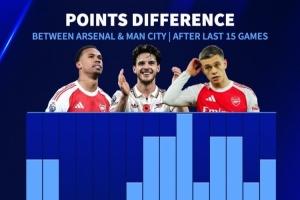 体育资讯2月19日讯 英超第31轮比赛,阿森纳客场2-2战平狼队。德国转会市场列出表格,盘点了近15场英超比赛阿森纳与曼城的积分差距,阿森纳最多领先7分,而目前多赛1场领先5分。