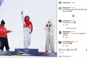 赛后苏翊鸣更新ins,晒出自己在领奖台单手指天的照片,并配文写道:“无法想象还有比这个更棒的生日礼物!”