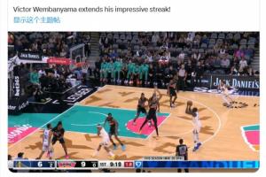 文班盖帽追梦三分后,已连续96场比赛有盖帽进账。