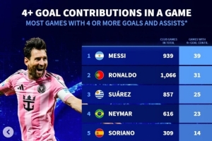 体育资讯11月24日讯 迈阿密国际在今日季后赛4-0完胜辛辛那提FC,梅西1射3传独造4球。《转会市场》数据统计显示,梅西也是俱乐部层面单场参与进球4+次数最多的球员。
