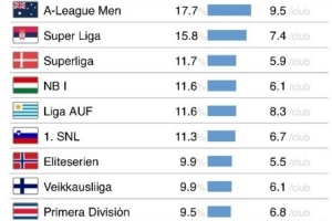 U21球员出场时间占比17.7%的澳超联赛,在本次排名中位居首位。塞尔维亚超级联赛(15.8%)和丹麦超级联赛(11.7%)紧随其后,排名二三位。