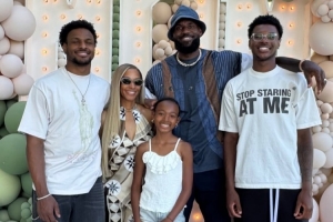 湖人前锋詹姆斯的小儿子布莱斯更新Instagram Story,晒出一张詹姆斯全家四口的合影,并写道:“感恩❤️”