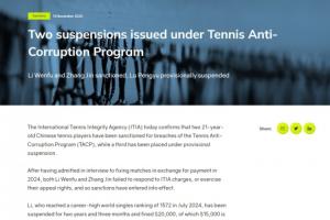 21岁的网球选手李文夫与张瑾在2024年的调查中坦言,此前为获取报酬参与了比赛操纵。因为二人未对ITIA指控作出回应,也未行使上诉权利,相关制裁已正式生效。