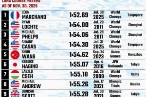 在男子200米混合泳项目历史总排名中,奥运冠军汪顺凭借1分54秒62的成绩位列世界第五。该成绩是他在2023年杭州亚运会时游出的,并打破亚洲纪录。