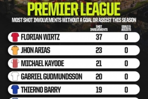 ① 维尔茨(利物浦) - 37次射门参与,0进球0助攻