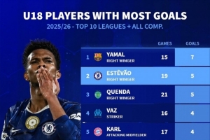 体育资讯12月6日讯 德国转会市场统计了本赛季前十联赛U18球员的进球数量,并列出榜单,亚马尔7球居首,埃斯特旺5球并列次席。
