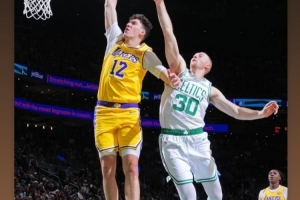 此前打凯尔特人拉拉维亚抢断反击一条龙,起飞滑翔单臂劈扣。湖人新秀蒂耶罗今日在INS调侃道:“这我见过他跳得最高的一次。😂”
