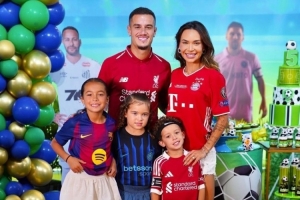 库蒂尼奥为儿子庆祝生日,一家人身穿国米、利物浦、巴萨和拜仁的球衣,这都是库蒂尼奥在欧洲效力过的俱乐部。