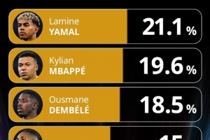 体育资讯12月12日讯 环球足球奖公布了年度最佳前锋的投票情况,亚马尔21.1%居首。