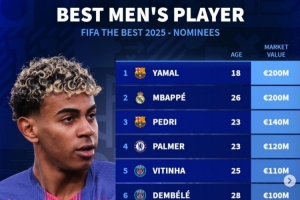 体育资讯12月16日讯 2025年FIFA年度最佳颁奖典礼将在就卡塔尔多哈举行,年度最佳球员(世界足球先生)也将揭晓。《转会市场》也列出了入选提名球员的身价排行榜,亚马尔和姆巴佩并列居首。