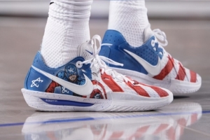 本场比赛,康宁汉姆穿上了客制版本的Nike GT Cut 3 PE,在美国队长主题基础上,将个人Logo融入到了美队的形象当中。
