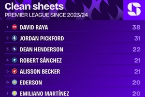 本场过后,从23-24赛季算起(注:拉亚在2023年夏天加盟阿森纳),拉亚在英超比赛中已38次零封对手,该统计数据排在同期英超各队门将榜首(排在第2、第3位的分别是皮克福德,迪恩-亨德森)。