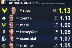 体育资讯12月21日讯 根据由statsmeister1与NER0cs基于HLTV数据联合发布的“COUNTER-STRIKE 2 - 2025”赛季综合统计,在严格限定为 CT方(防守方)、线下赛事(LAN)、对阵世界排名前20战队、且出场地图数超过50张 的 顶级主防者(TOP RATED ANCHORS) 评分榜单中,选手 ropz 以 1.13 的评分位列榜首;
