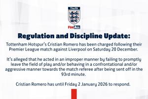 托特纳姆热刺的克里斯蒂安・罗梅罗,在12月20日(周六)对阵利物浦的英超联赛赛后被指控。