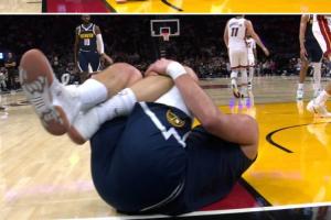 掘金当家球星约基奇在半场比赛结束前被队友斯潘塞·琼斯踩到腿部误伤致膝盖过度伸展提前退赛。