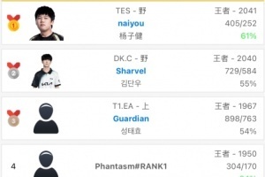 体育资讯1月2日讯 根据排位统计小程序显示,韩服前十排行榜更新,TES打野选手naiyou登顶。