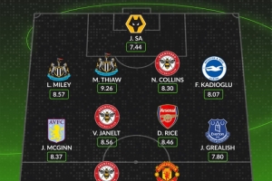 中场:麦金(维拉)、雅内特(布伦特福德)、赖斯(阿森纳)、格拉利什(埃弗顿)
