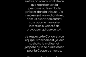 我尊重民主刚果及其国家队。老实说,我衷心希望他们一切顺利,也希望他们能成功晋级世界杯。如果我的行为被误解了,我对此深感遗憾,因为这完全不是我的本意。