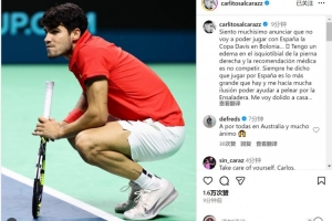 阿尔卡拉斯写道:“我非常遗憾地宣布,我无法代表西班牙参加在博洛尼亚举行的戴维斯杯比赛。我的右腿腘绳肌出现水肿,医生建议我不要参赛。”