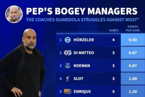 体育资讯1月8日讯 德国转会市场统计了瓜迪奥拉对阵不同教练的场均积分,并列出瓜帅克星榜单,赫尔泽勒居首,斯洛特、克洛普、阿莫林在列。