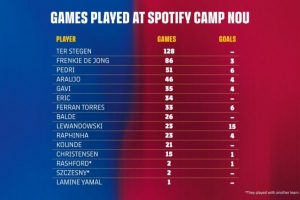遗憾的是,出场次数前三的球员均无法在这场主场回归战中登场。德容在上一场比赛连吃两黄后停赛,而特狮和佩德里则均有伤在身。