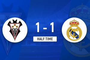 第45+3分钟,皇马左侧角球机会,球罚向禁区,赫伊森头球攻门被利佐亚因扑出,马斯坦托诺马上补射将球打进,皇马1-1阿尔瓦塞特。↓