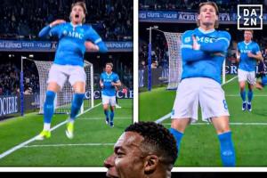 本场比赛第10分钟麦克托米奈进球,随后做出的庆祝动作酷似姆巴佩。但是随后VAR介入,判罚此粒进球越位在先,进球无效。