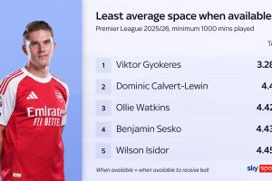 在英超球员持球时的平均“可行动空间”排行榜上,约克雷斯以3.28米的数据排名英超最低,远低于其他球员。