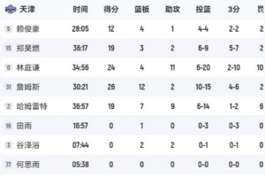 此役,天津主力发挥出色全部得分上双,合计砍下100分,反观替补5人登场合计仅得2分。