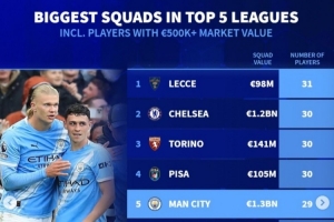 体育资讯1月20日讯 曼城已经官宣签下水晶宫队长格伊,《转会市场》也统计了本赛季五大联赛球队人数最多情况,莱切居首。