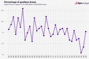 Opta指出,本赛季英超0-0比赛占比7.7%,2020-2021赛季(7.9%)之后最高。