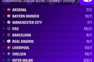体育资讯1月22日讯 欧冠联赛阶段第7轮比赛战罢,相关机构给出了欧冠夺冠的最新赔率,阿森纳居首,拜仁、曼城、巴黎前四。