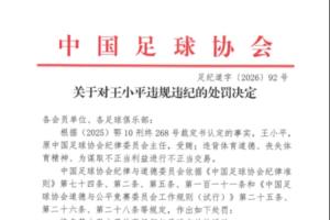 体育资讯01月29日讯 中国足协公布足球行业“假赌黑”处罚决定,原中国足球协会纪律委员会主任王小平受贿,进行不正当交易,终身禁止从事任何与足球有关的活动。