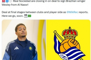 体育资讯1月29日讯 据知名记者罗马诺报道,皇家社会接近签下巴西边锋韦斯利。