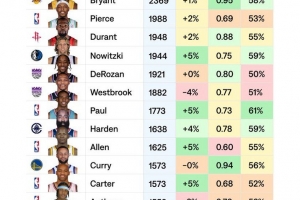 注:关键时刻数据从1996-97赛季开始统计