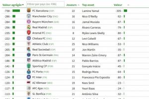 体育资讯01月31日讯 CIES足球天文台更新了最新的球队青训球员身价榜,目前巴萨以7.38亿欧的球员总身价高居榜首,曼城、拜仁分列二三。