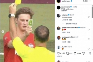 哈维·西蒙斯社媒晒出自己被出示黄牌的照片,以及球员向裁判出示UNO卡牌的梗图,配文:“UNO说——抽牌(双关平局)。”