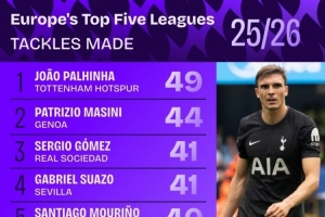 本赛季五大联赛成功抢断排名: