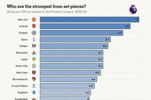 体育资讯02月03日讯 据TA报道,本赛季至今,曼联是英超定位球效率最高的球队,每100次定位球机会就能打入8球,高于阿森纳的7.3球。