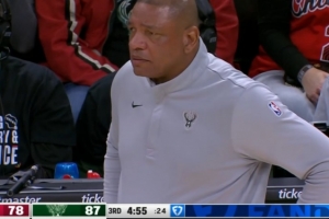 雄鹿上半场领先25分,但下半场被打出27-10,分差缩小至8分了,老里暂停但是没啥效果。