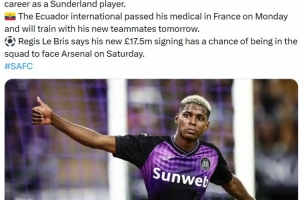 报道称这位厄瓜多尔国脚周一在法国通过了体检,并将于明天与新队友一起训练。主教练雷吉斯·勒布里斯表示,这位球队1750万英镑引进的新援有可能在周六对阵阿森纳的比赛中进入大名单。