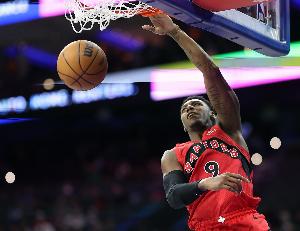 霸气侧漏!杰伦·约翰逊强突乌布雷 顶着两人双手滑翔暴扣!