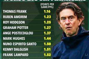 当涉及到切尔西、阿森纳、曼联、曼城、热刺和利物浦在英超时代的主教练时,弗兰克处于绝对的底部。在他执教的25场比赛中,球队仅拿到了29个积分。这使得他的球队牢牢地位居下半区,距离降级区第18名的西汉姆联仅差6分。热刺正面临被拖入与利兹联、诺丁汉森林和水晶宫的保级大战的危险。在0-2输给曼联后,他们可能在周日过后被水晶宫反超。